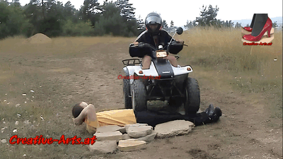 The mistress was trying to go big with her company and she tried to buy a company from one of his biggest and former friend. She tries to tell him and tries to address it every single time, but nothing seems to work for her. She gets frustrated because she is not one to beg so she decides to push his hand by making him get on the ground while she runs him over under a quad bike